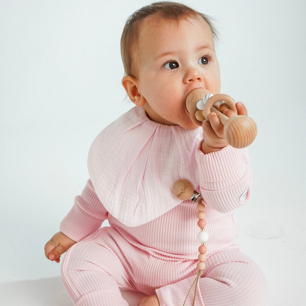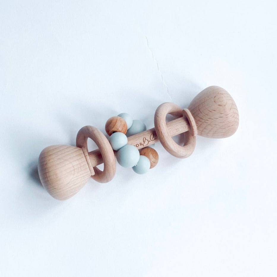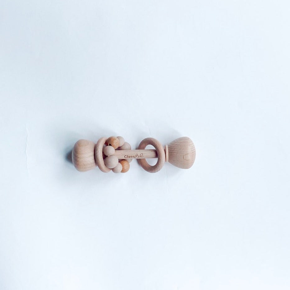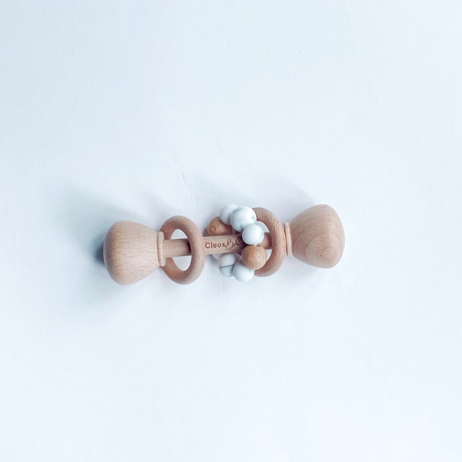Available in four delightful colors, including Marble White, Marble Pink, Baby Blue, and Nude, our rattles are not only visually appealing but also a sensory delight for your little explorer. The combination of natural wood and a ring of silicone beads creates an intriguing texture that's gentle on tiny gums.
